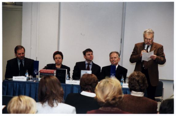 S tiskovne konference ob izidu Slovenskega pravopisa 2001 v Cankarjevem domu, novembra 2001. Z leve proti desni: dr. Vojislav Likar (glavni urednik Založbe ZRC), dr. Varja Cvetko Orešnik (predstojnica Inštituta za slovenski jezik), dr. Oto Luthar (direktor ZRC SAZU), dr. Jože Toporišič (glavni avtor pravopisa) in dr. Janez Orešnik (predsednik Znanstvenega sveta Inštituta za slovenski jezik).